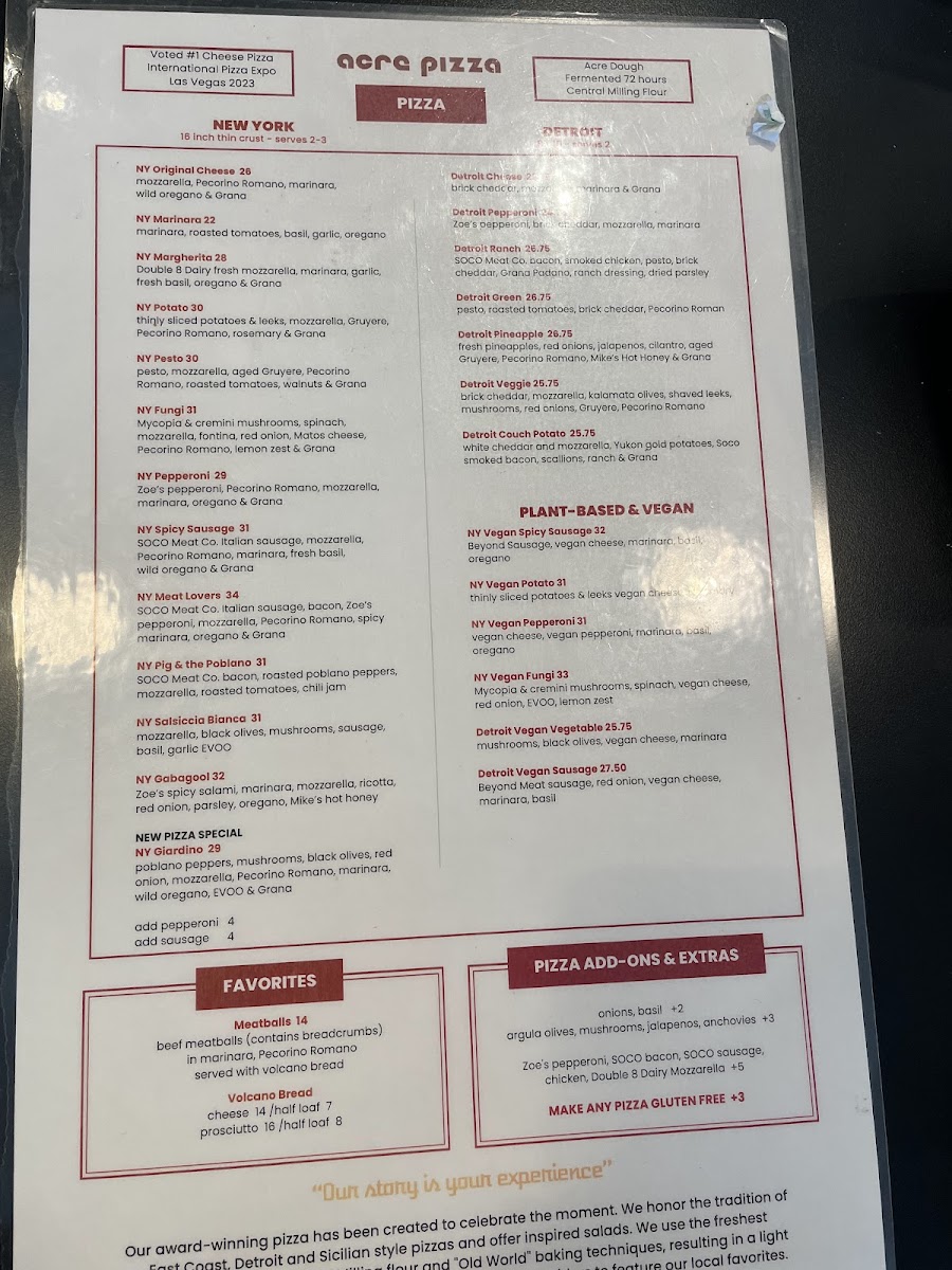 From a reviewer’s perspective, the menu at Acre Pizza offers a well-rounded and creative selection that balances classic comfort with inventive twists. The salad lineup, including the Orchard, Acre Greek, Acre Chopped Arugula Salad, and Caesar, provides fresh and flavorful starters, while standout favorites like Meatballs, Volcano Bread, and the indulgent Volcano Bread - Prosciutto set a strong tone for the meal. The pizza selection is clearly the highlight, with 16-inch thin crust options such as NY Pig & Poblano, NY Gretzy (Prosciutto and Pineapple), NY Pesto, NY Margherita, and NY Spicy Sausage, alongside hearty Detroit-style pies like Detroit Cheese, Detroit Pepperoni, Detroit Veggie, and Detroit Ranch. There’s also thoughtful inclusion of plant-based choices like NY Vegan Pepperoni and Detroit Vegan Sausage, making the menu accessible to a wider range of diners. Desserts such as Cheesecake, the Acre Salted Chocolate Chip Cookie, and the Salted Brown Butter Crispy Treat round out the experience nicely. Although specific prices aren’t listed, the variety-from pantry items like Pizza Dough and Dough - Chocolate Chip Cookies (6 Count) to drinks like Mexican Coke and Saratoga Bottled Water (Sparkling)-suggests a menu designed for both dine-in enjoyment and take-home convenience, leaving a satisfying final impression.